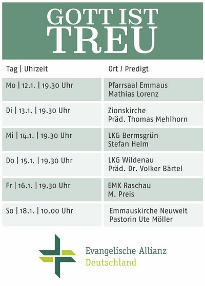 Gott ist treu!Unter diesem Thema treffen sich auch in Schwarzenberg Christen aus verschiedenen Gemeinden zur Allianzgebetswoche 2026.