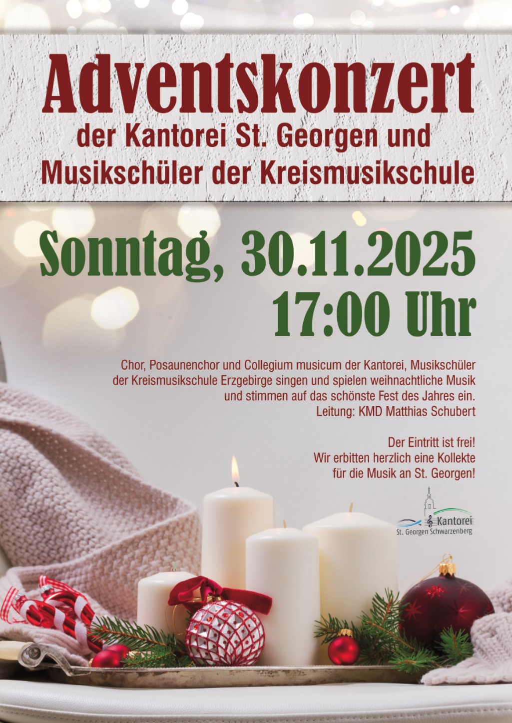 Der Eintritt ist frei. Wir erbitten herzlich eine Kollekte für den musikalischen Nachwuchs an St. Georgen.